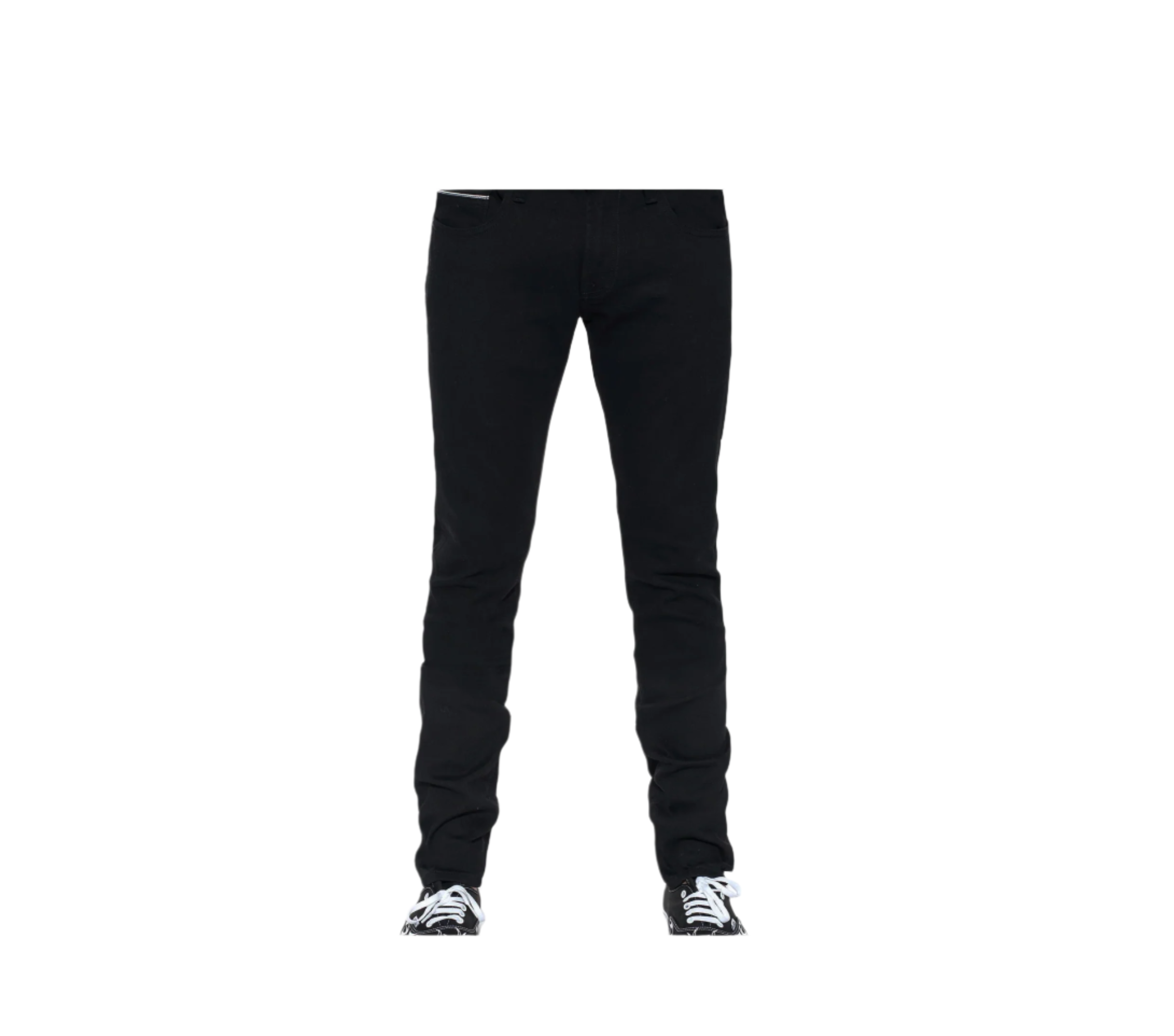 Slim style with a relaxed waist and a low rise. This black rocker slim is crafted from premium stretch denim with rip and repair treatment. The leg narrows from the knee to the ankle.
