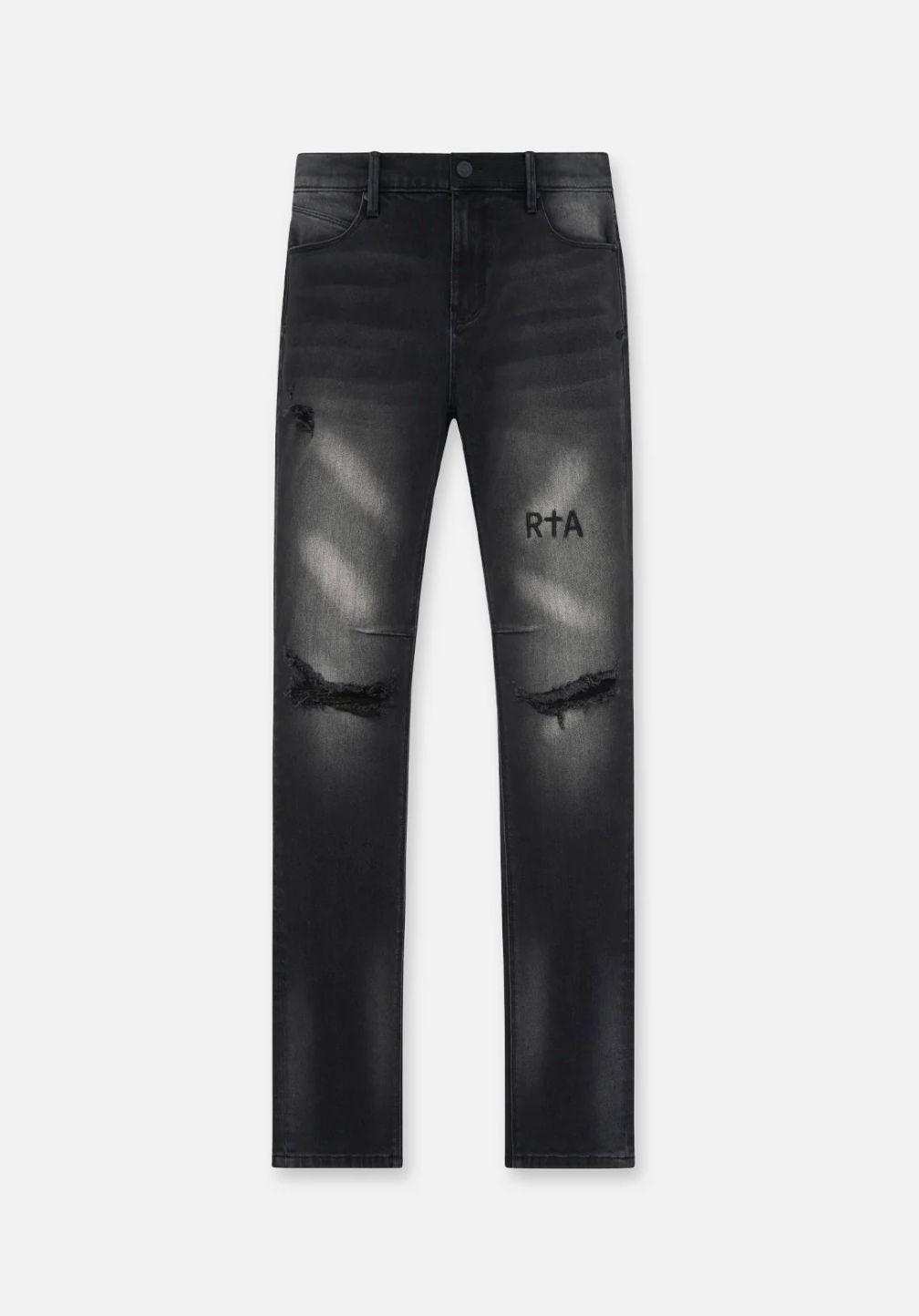 The Denis flared skinny jean, with a slight stretch, presented in light blue wash with paint splatter inspired bleached detailing. This jean features stitched detail at the waistband and distressing at the knee.